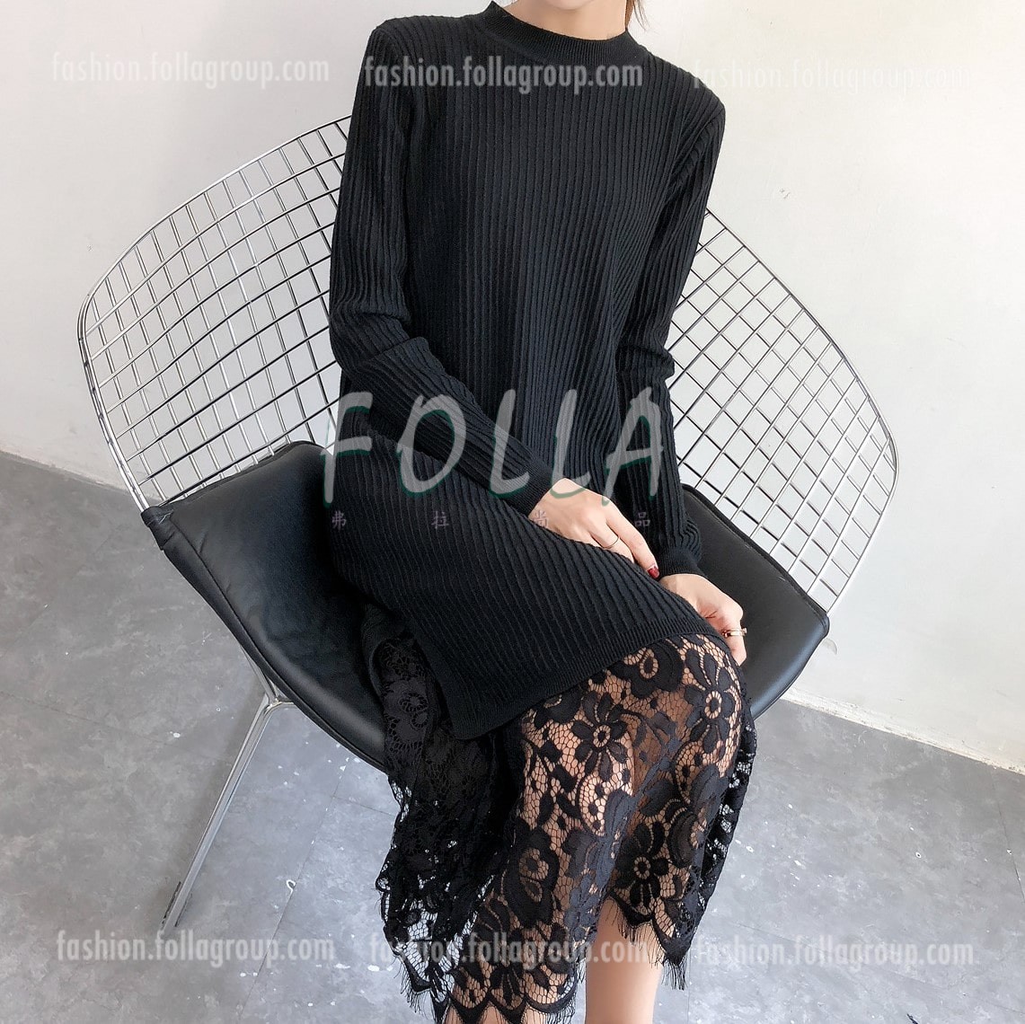 Knitwear Long Dress with Lace. Free Size with 5 Colours Available – Black, White, Khakis, Apricot & Purple Red.